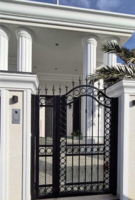 דוגמאות לשער כניסה של בתים פרטיים בשילוב של פנל אינטרקום עם מצלמה ומקודד לפתיחת דלת.